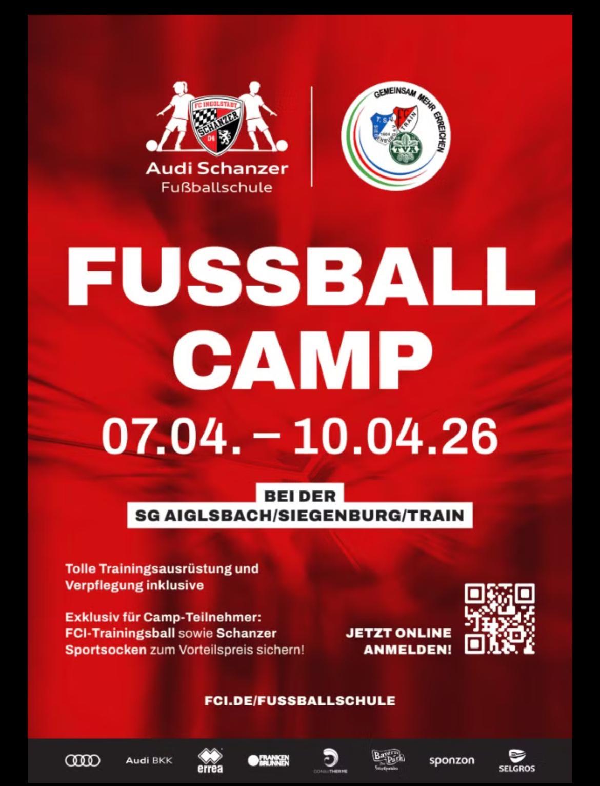 In der zweiten Osterferienwoche 2026 findet wieder das AUDI SCHANZER FUSSBALL CAMP bei der SG Aiglsbach/ Siegenburg/ Train (Dienstag, 07. April bis Freitag, 10. April) für alle Kinder der Jahrgänge 2013 – 2020 statt (Sondervereinbarungen ausgenommen).